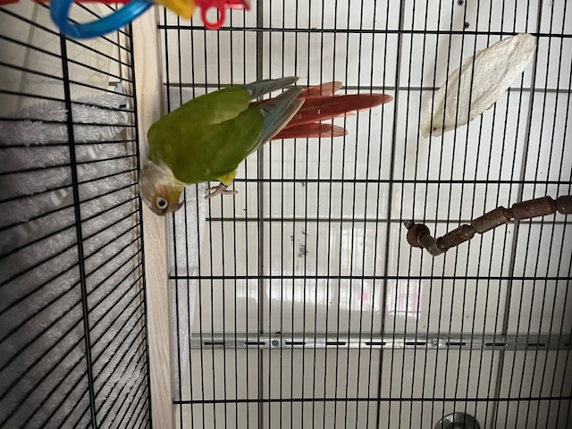 Skippy zit samen met een Pyrrhura en zij hebben een haat liefde relatie. Skippy kan ook alleen geadopteerd worden in een voliere met andere maatjes.