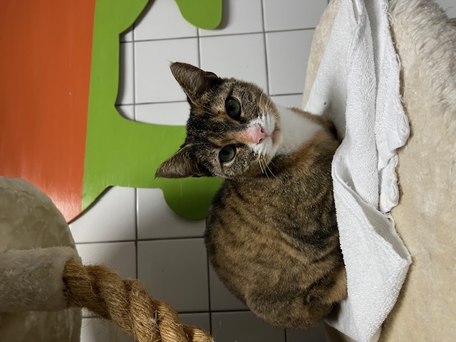 Dit is Odine en heel lief en rustig poesje met een misvormd pootje waar ze zich overigens wel heel goed mee kan redden die graag je aandacht wilt. Een maatje erbij vind ze ook heel gezellig.