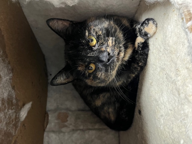 Deze prachtige schildpadpoes is een echte lieverd. Ze geniet volop van aandacht en vindt het heerlijk om geaaid te worden. Als je haar even kroelt, begint ze meteen te ontspannen — ze houdt er echt van om in het middelpunt van de belangstelling te staan.