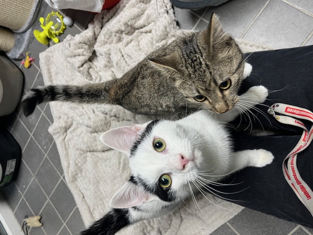 Kiki en Kindle zijn zus en broer die onafscheidelijk zijn. Ze spelen en slapen graag samen. Zodra je de kamer binnenkomt komen ze aangelopen om je te begroeten.