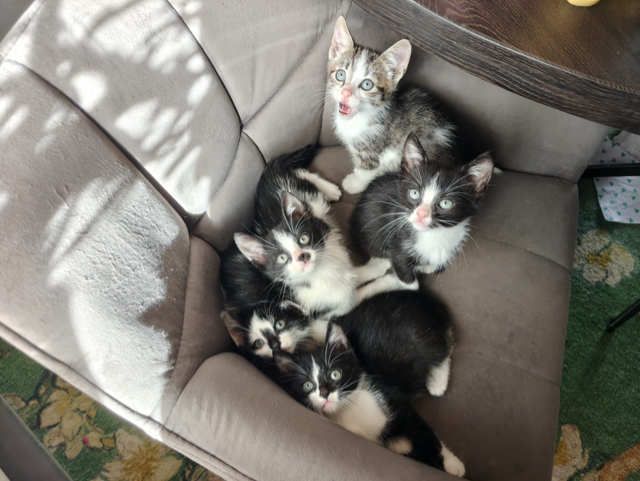 Wij zijn vijf lieve, speelse kittens die klaar zijn om hun forever-huisje te vinden! Wij zijn allemaal gezond en opgegroeid in een super gezellig gastgezin met een hond, cavia’s, andere katten en kinderen. Wij zijn dus al wat gewend!